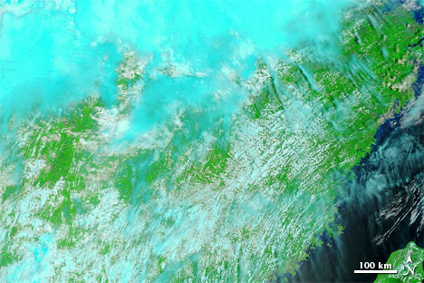 Clouds obscure most of this MODIS image acquired on June 18, 2011.