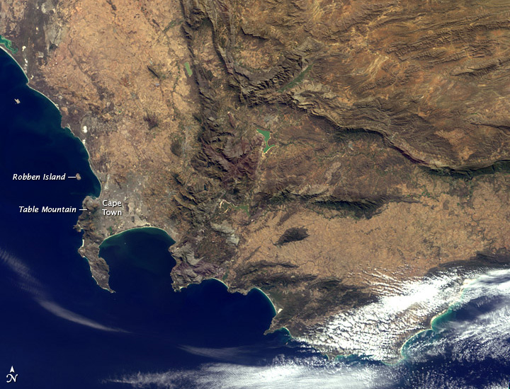 On July 29, the Earth Observatory posted an image (above) from the MISR Mystery Image contest. How did you do? Did you guess South Africa? The image is rotated so that north is in the lower right. Visible as a cement-colored grid at this distance, Cape Town sits at the head of the U-shaped bay, called False Bay.
