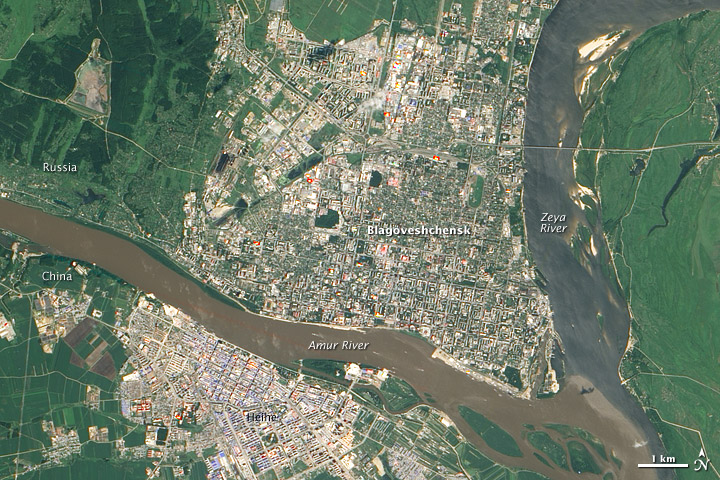 However, sometimes we don’t cover an event because we cannot see it. Take, for instance, the recent tornado in Blagoveshchensk, a city on the Amur River in eastern Russia, near the border with China. The rare tornado was initially reported as a super-powerful EF4 or EF5 strength storm. NASA sensors, such as the Advanced Land Imager (ALI), have been used to observe storm damage from comparable storms: see the April 2011 ALI imagery of Tuscaloosa, Alabama, for example.