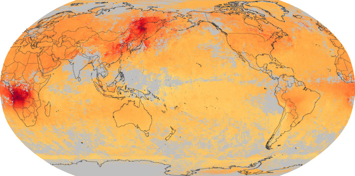 The image was made with data from the MOPITT sensor on the Terra satellite. High concentrations of carbon monoxide are red and lower concentrations are yellow. (Regularly updated images are on the NEO web site.)