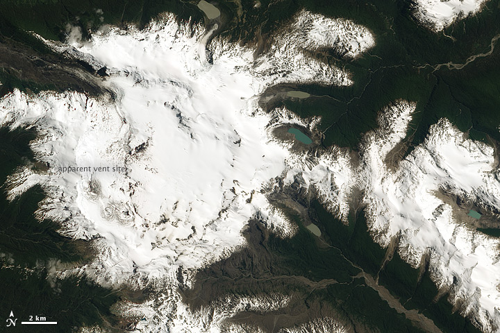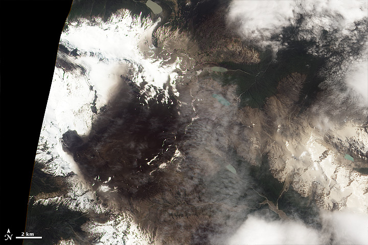 Just two weeks later, with no new activity, almost all the ashfall seems to have “disappeared.” Fresh snow fell and covered much of it. Also, we got a much better shot with ALI of the volcano, getting a very nice view of the entire caldera, the glacier draining it out of the northeast, and forests in the alpine valleys. The ashfall was nowhere near as extensive and damaging as the Puyehue eruption, which at one point spewed out ash that circled the globe.