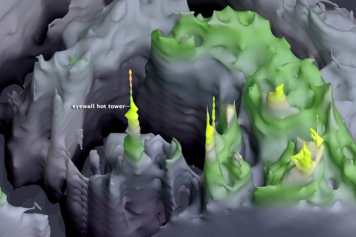 Interestingly, the “hot” in the name comes not from the temperature of the air that hot towers loft high into the atmosphere, but because of the latent heat the rain clouds release. “The latent heat is an important ingredient in fueling the updrafts that allow the towers to rise to such icy heights, so ‘in honor’ of the role that latent heat plays, the towers are called hot towers,” explained Owen Kelley, a research scientist based at NASA’s Goddard Space Flight Center.