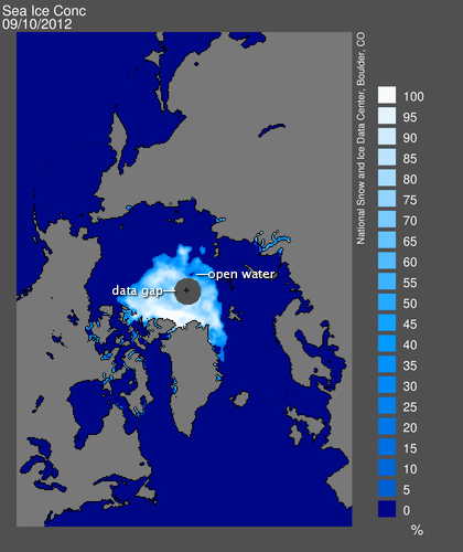 Since 1979, scientists have relied on a variety of satellite sensors, including the Scanning Multichannel Microwave Radiometer (SMMR), the Special Sensor Microwave/Imager (SSM/I), the Advanced Microwave Scanning Radiometer – Earth Observing System (AMSR-E), and (most recently) the Special Sensor Microwave Imager/Sounder (SSMIS). The satellites carrying these sensors fly in near-polar orbits (see the Catalog of Earth Satellite Orbits for more information). This means that they pass close to the pole, but not quite over it. As a result, many sea ice images have a gap in the data extending from 87 degrees northward to the North Pole. The gap appears as a black circle over the pole in the image from August 2012.