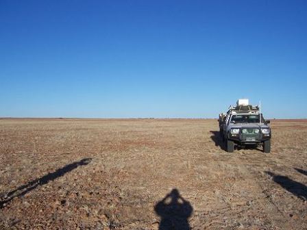 Their Eyre Creek site (25.000°S 139.000°E) is quite close to the spot we showed in the puzzler (139.216 E, 24.601 S). Go here for a full map of the areas RGSQ has surveyed. The picture below offers a glimpse of what the landscape looks like from the ground. No dunes in sight, but the group did report the area featured “undifferentiated Cainozoic gravel and pebbles of silicifed rock (i.e. gibbers).”