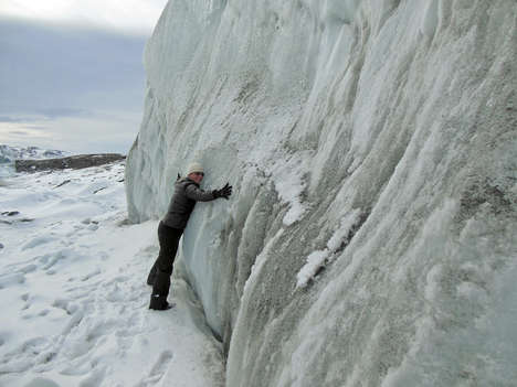 From the Global Climate Change Earth Science Week Blog: Explorer Christy Hansen hugs the Russell glacier, part of the Greenland Ice Sheet. Image courtesy Christy Hansen, JPL