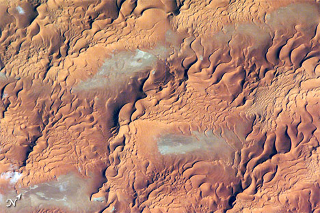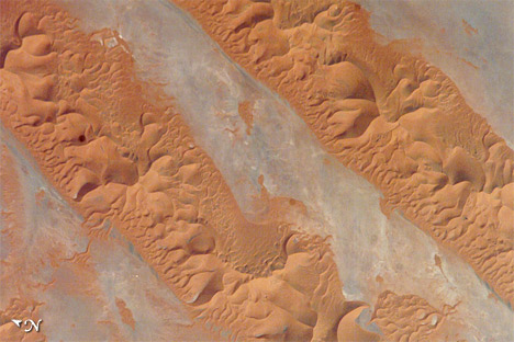The flat areas between dunes are known as dune streets, and they are unmistakable in Algeria’s Erg Oriental. In between the streets, star dunes sit atop linear dunes. Story: Erg Oriental, Algeria