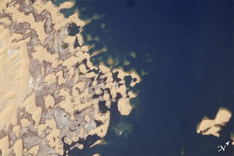 Dunes form in arid conditions, but conditions can change. The manmade Toshka Lakes of Egypt flooded old dune landscapes. Depending on lake levels and the underlying topography, some dunes are completely flooded while the crests of others poke above the water surface. Story: Toshka Lakes, Egypt