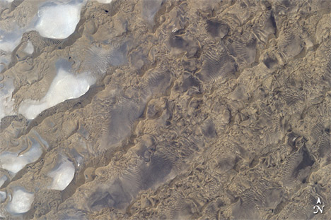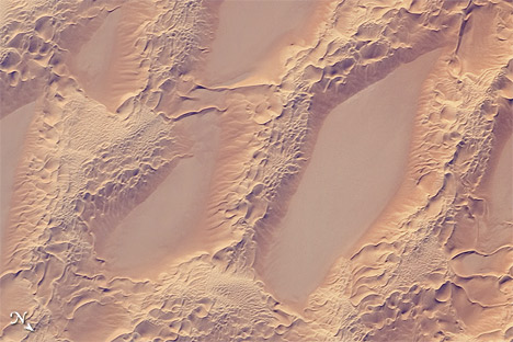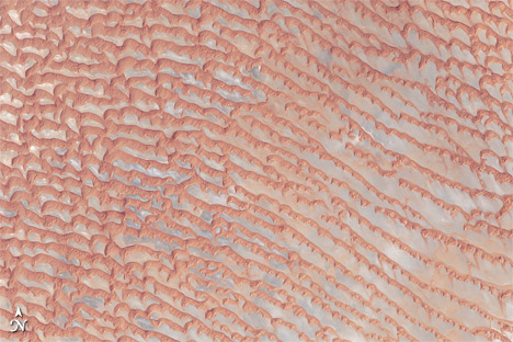 The November 2012 issue of National Geographic features an article, “Sailing the Dunes,” about aerial trips over sandy deserts. The author, George Steinmetz, has flown in light aircraft in high winds—a dangerous combination. Yet the same winds that make the flying so dangerous also sculpt some of the world’s most beautiful landscapes. Several of the places mentioned in the article have also been covered by the Earth Observatory. Here is a sampling of some of those places, plus some additional dune-rich landscapes.