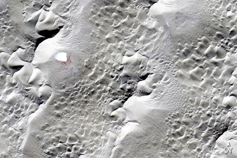 Some of the world’s most complex dune formations occur in the Badain Jaran Desert of Inner Mongolia. Small lakes dot flat areas in between dunes, which have been characterized as “complex reversing mega-dunes developed from compound barchanoid mega-dunes.” Story: Elevation Map of the Badain Jaran Desert