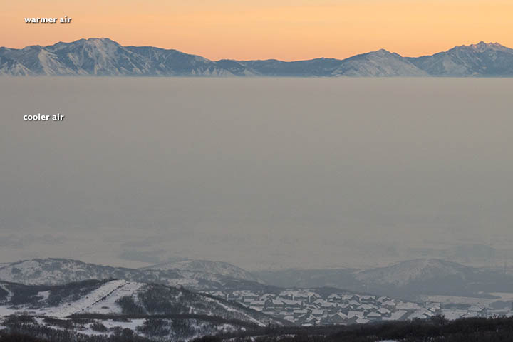 Normally temperatures decline with altitude, but meteorological conditions across the Great Basin set up a situation in which the opposite occurred for a prolonged period. For much of January, temperatures increased with altitude, creating what’s known as a temperature inversion. During the peak of the inversion, temperatures were -15.5ºC (4.1ºF) at the surface and 7.6ºC (45.7ºF) at 2,130 meters (6,988 feet), University of Utah meteorologist Jim Steenburgh reported on his blog.