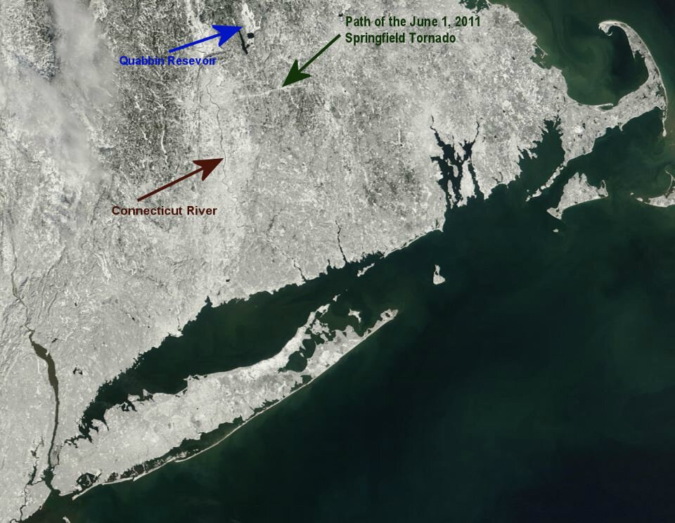 It seems that the monumental snowfall highlighted some land features of New England, including its longest river, one of the largest manmade reservoirs in the United States (Quabbin), and the scar of a vicious tornado.