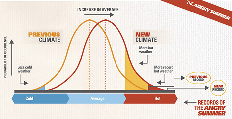 The Climate Commission pointed out that Australia’s average temperature has increased by 0.9°C (1.6°F) since 1910, and went on to say that, while that temperature increase might seem small, “When the average temperature shifts, the temperatures at the hot and cold ends (tails) of the temperature range shift too. A small increase in the average temperature creates a much greater likelihood of very hot weather and a much lower likelihood of very cold weather.”