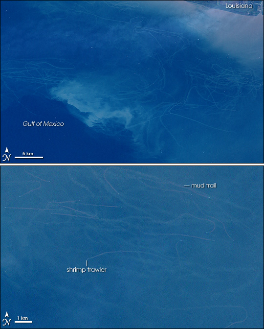 Fourteen years ago, the Enhanced Thematic Mapper Plus on Landsat 7 acquired these images of mud trails off the coast of Louisiana. They were caused by bottom trawling in the Gulf of Mexico, a fishing technique that involves dragging large nets across the sea floor.