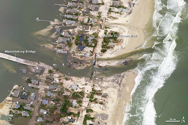 Our gallery of Sandy images conveys an abstract, distant sense of the event. In satellite images, the eye is drawn to the awesome and beautiful cloud forms; to the potent, organized march across the skies; to the incredible scale of the storm. But the shoreline of my New Jersey childhood was nearly wiped clean, and a satellite can’t really show that. It’s not until you get down to the street level — such as the aerial photo below — that the human cost comes into better focus.