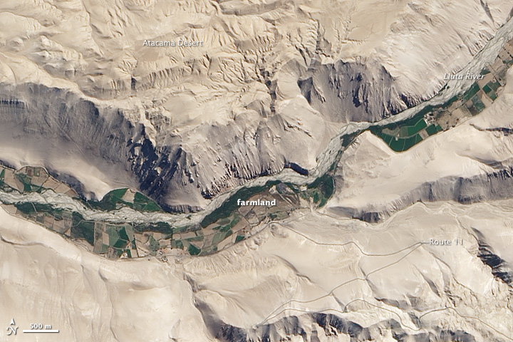 The unique perspective—and beauty—of satellite imagery never ceases to fascinate me. In this case, the satellite perspective of Lluta River does a remarkable job of illustrating how constricted and precious water and farmland is in this extremely arid region. But distance also blurs detail. I was curious about what this river valley looked like from the ground, so I did some searching on Panoramio and Flickr. I’ve included two of the many shots I came across at the top and bottom of this post. The panorama at the top was taken by Gustavo Canales; Julie Laurent took the photograph at the bottom.