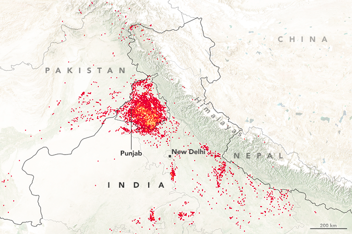 Smoke and fire in northern India have become common in October and November during the last three decades because farmers increasingly use combines to harvest rice and wheat. Since these machines leave stems and other plant residue behind, farmers have started to use fire to clear the leftover debris away in preparation for the next planting.