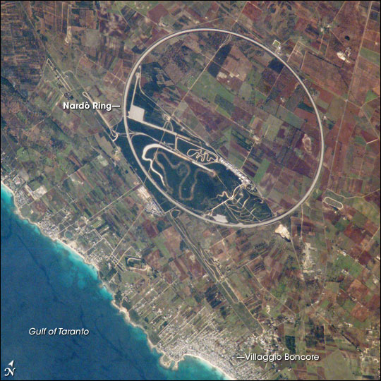 Being an automotive enthusiast, as well as an amateur racer, I’ve always loved images of the Nardo Ring. This racing circuit is a perfect circle, and massive in order to be used for vehicle testing. Highways, city girds, and other roadways are often prominent features in astronaut photography, but the scale and precision of the Nardo Ring are impressive when set against the Italian farm fields. It’s easy to see, even from up there, the impact the racing and automotive culture has on Italy, and the rest of the world. — Paul Przyborski, programmer/dba/designer