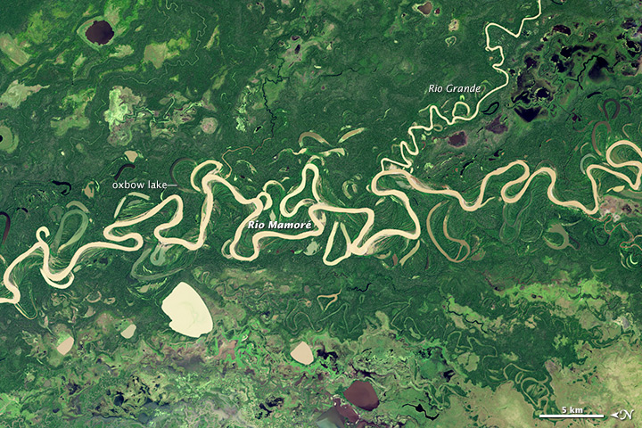 If I’m not mountain biking, you will probably find me kayaking—a hobby partly inspired by regularly seeing incredible views of Earth’s rivers from space at work. What I love most about this image of Rio Mamoré in the Amazon Basin is how you can see how much the rivers meander and migrate over time. Interestingly, researchers studying rivers in this region found that the greater the amount of sediment from external sources (glacial, volcanic, or human activity), the more likely the rivers were to meander. — Kathryn Hansen, science writer