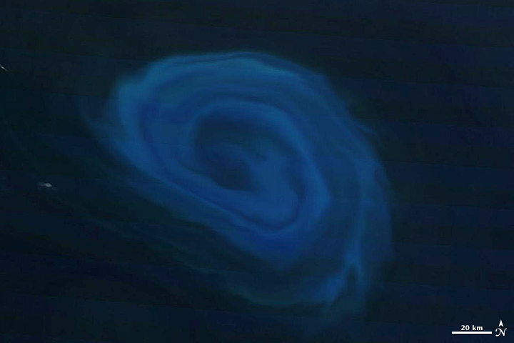 If you’ve ever read the blog FYFD or even spent time looking carefully at cream swirling around in your coffee, you’ll know why I love this image. There are times that fluids just going about their mundane business of mixing and flowing make patterns that are insanely beautiful. Check out our original story for a more detailed view of the von Kármán vortices swirling away from the small island in the middle of the Bay to see what I mean. — Adam Voiland, science writer