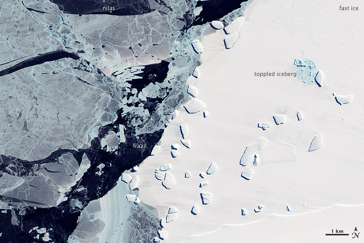 I really like this image because of the variety of blue and white hues. There is young ice, old ice, icebergs that are trapped in sea ice, and all of it is accentuated by an oblique sun angle casting shadows and highlighting texture. — Kevin Ward, team leader