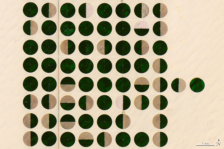 A: The features visible in these images are the irrigated crops mainly clustered in a center-pivot irrigation systems; the diameter of the pivots range from 700 to 820 meters. The total irrigated area at the beginning of this year was about 79,000 hectares.