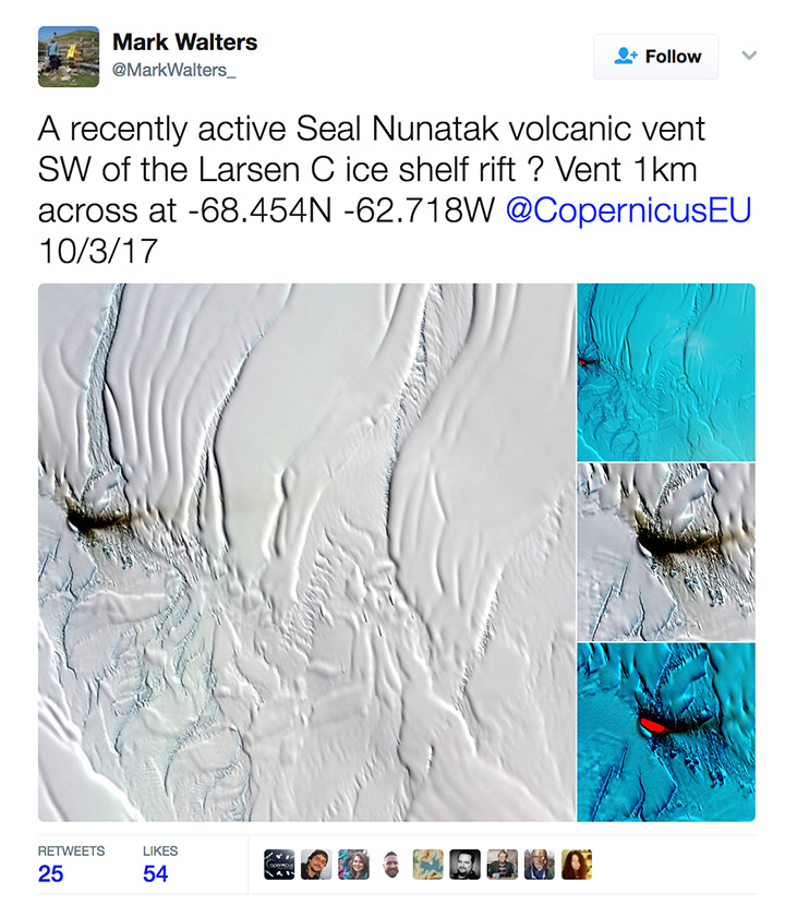 On April 4, 2017, archaeologist Mark Walters tweeted an intriguing set of satellite images of a dark smear on the Larsen C Ice Shelf. Was it volcanic ash from a recently active volcanic vent, he wondered?