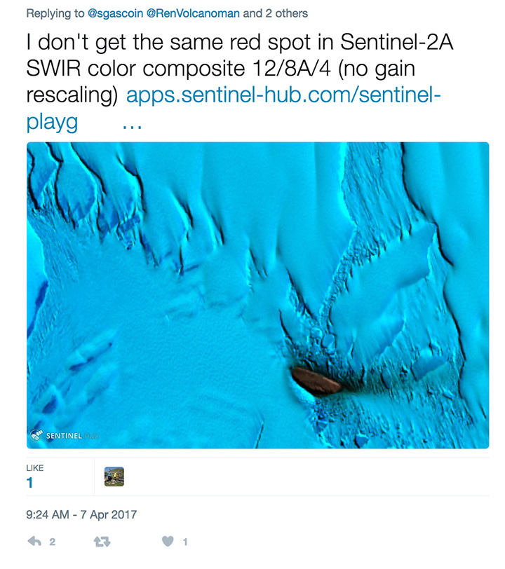 The tweet — and especially a bright, red spot in an infrared image (lower right in the screenshot) — generated interest among folks who follow Earth science, Antarctica, and volcanoes. New volcanic activity in this area would be surprising and newsworthy. While there is some evidence of volcanic activity near this part of the Larsen Ice Shelf, the most recent reports date back to 1980.