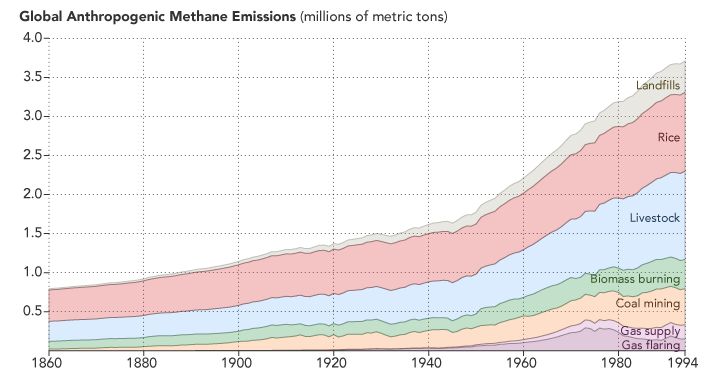 “If you focus on just the past five decades—when modern scientific tools have been available to detect atmospheric methane—there have been fluctuations in methane levels that are harder to explain. Since 2007, methane has been on the rise, and no one is quite sure why. Some scientists think tropical wetlands have gotten a bit wetter and are releasing more gas. Others point to the natural gas fracking boom in North America and its sometimes leaky infrastructure. Others wonder if changes in agriculture may be playing a role.”