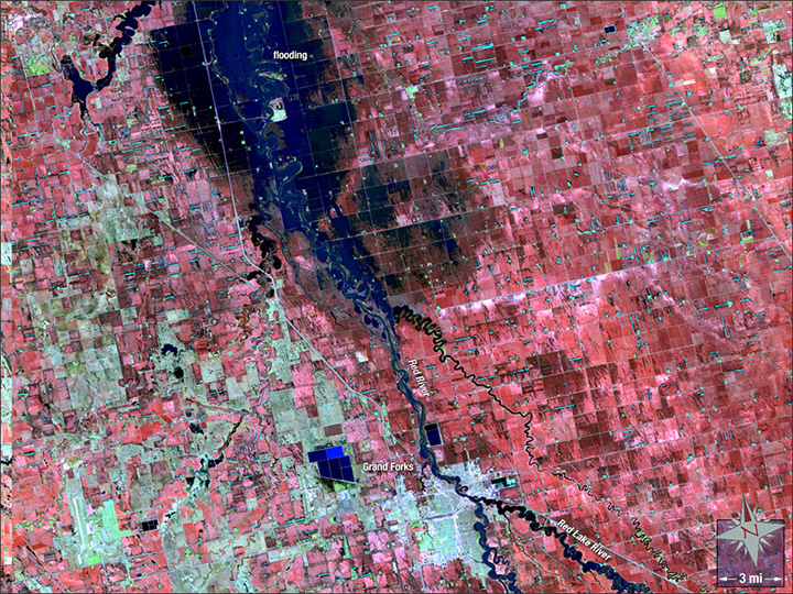 The false-color Landsat 5 image above shows Grand Forks, North Dakota, as it appeared on May 4, 1997. At that point, flood waters had mostly retreated, but the river still appeared swollen, with water lingering in floodplains just north of the city. Water appears dark blue, while structures are off-white.