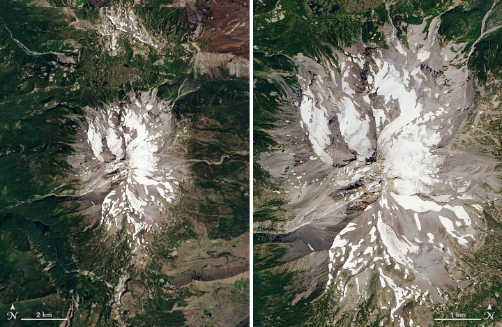 Left: a natural-color Landsat 8 image of Mt. Jefferson, by Robert Simmon. Right: A pan-sharpened version of the same data, by Joshua Stevens.