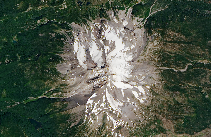 A true-color Landsat 8 image of Mount Jefferson, Oregon, at a resolution of 15 meters per pixel.