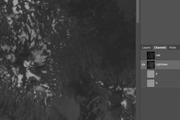 Go back to your RGB composite image. In the Channels window click on Lightness to isolate that channel. Your image should change to black and white to indicate that only the selected channel is active: