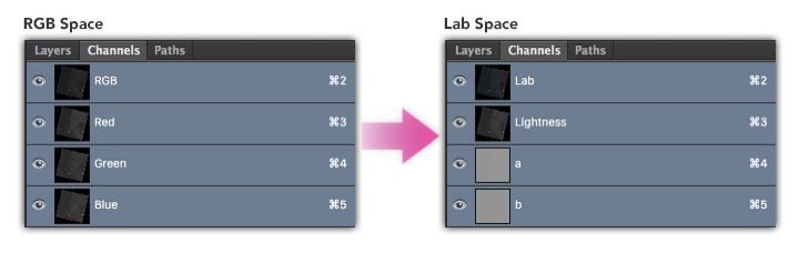 In the Photoshop menu, go to Image –> Mode -> Lab Color. You won’t see the image change, but if you look at your image channels, you will see that you now have Lightness, a, and b.