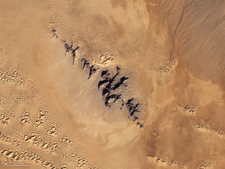 The natural color image here is from the now-defunct Earth Observing 1 (EO-1) satellite using its Advanced Land Imager (ALI). The image was acquired on December 16, 2012. This late-year scene was just days before the solstice (the farthest south the Sun appears in the sky), so the tallest sand dunes and the volcanic peaks cast unusually long shadows across the ground.