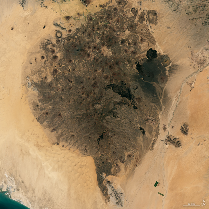 The natural color image here is from the Landsat 8 satellite using its Operational Line Imager (OLI) instrument. The image was acquired on October 3, 2017. The volcanic cinder cone field stains the landscape of bright sand and tall dunes in the El Pinacate y Gran Desierto de Altar Biosphere Reserve.