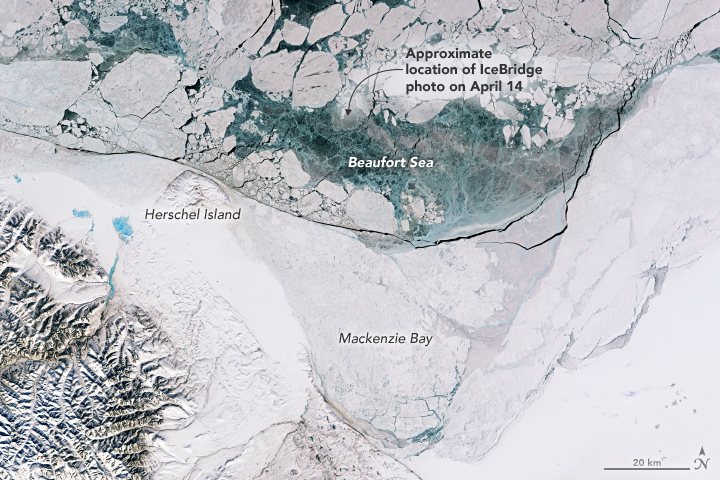 With springtime comes sunlight and warmth that advance the melting and breakup of Arctic sea ice. Varied patterns and textures appear across the icescape, and many are visible in this image, which was our Image of the Day on April 30. This satellite image includes the area photographed a day earlier by Operation IceBridge—the same photograph that sparked discussion on our blog and on news and social media about what might have caused the holes in the ice.