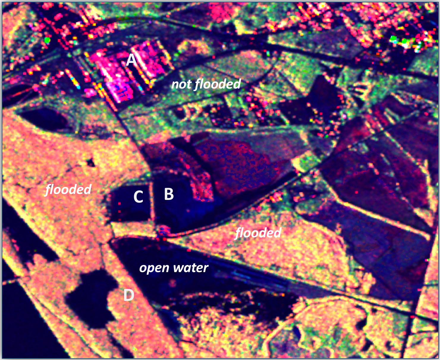 Above: UAVSAR polarimetric decomposition image taken on September 17, 2018 near Cheraw, SC (same area as Civil Air Patrol photo above). Pink denotes urban areas whereas red/orange denotes inundated forests. Dark blue or black are flooded open water; roads can be black even if not flooded. Green, yellow, and light blue color denote areas that are not flooded. Note: Red — Double bounce scattering (flooded forests and urban); Green – Volume scattering (unflooded forests); Blue – specular scatters (dry bare ground, open water). Credit: Yunling Lou/JPL, Bruce Chapman/JPL and Gerald Bawden/HQ