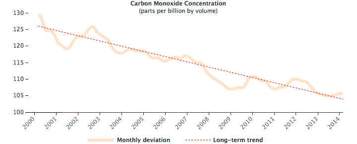 4. Using MOPITT, atmospheric scientists have tracked global trends in carbon monoxide for nearly two decades. The good news: concentrations of the toxic air pollutant are declining.
