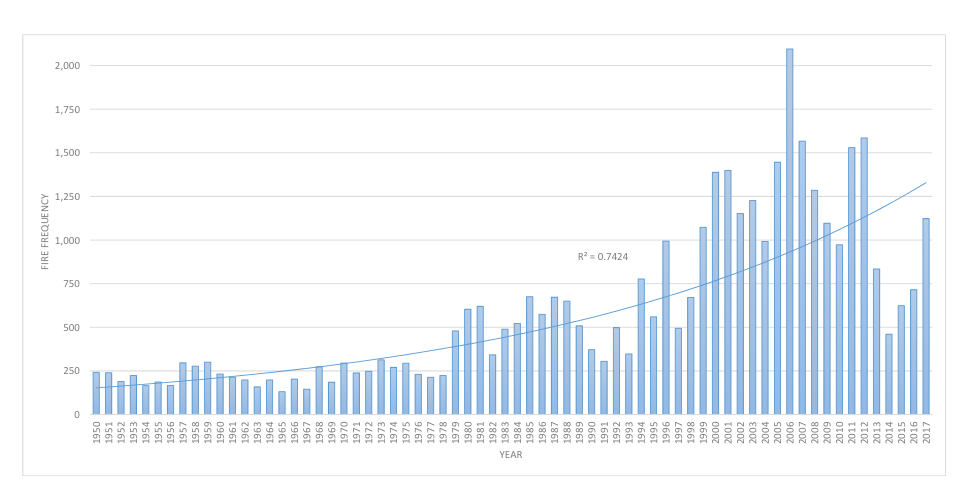 Over the past six decades, there has been a steady increase in the number of fires in the western U.S. In fact, the majority of western fires—61 percent—have occurred since 2000 (shown in the graph below).