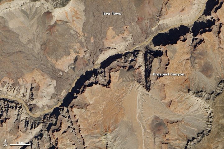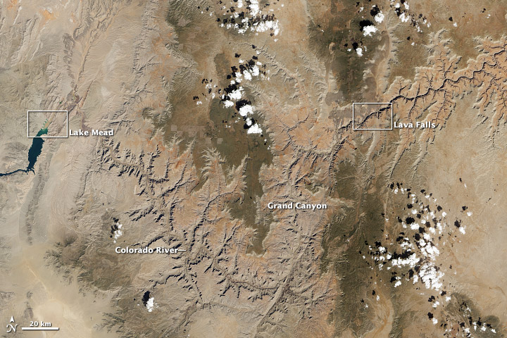 Satellites usually offer nadir (straight-down) views of the canyon, such as these natural color images acquired with the Landsat 8 satellite in April 2013. The wide view shows the canyon in context with the surrounding plateau, while the detailed image shows an area around the rapids known as Lava Falls (in reference to old lava flows in the area).