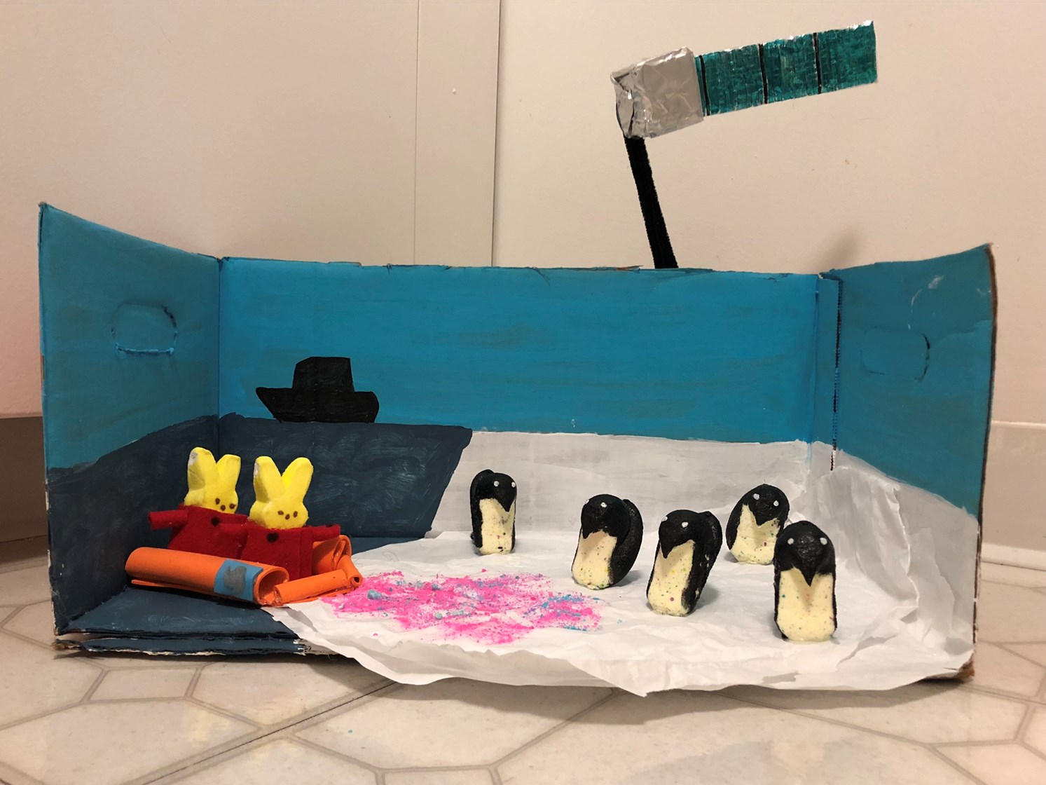 Antarctic peep-searchers use Landsat images of peep-guin peep (er, poop) to measure the health of colonies. Penguin peep (er, poop) is bright pink and bright blue, depending on if they’re eating shrimp or sardines. What they’re eating and how much peep (er, poop) is on the ice is an important indicator of peep-guin health. In this diorama, intrepid peep-searchers are bundled up in their cozy Arctic gear, visiting the peep-guin colony from a peep-search ship to ground-truth the colony counts they’re getting with satellite data. Reminder to all peep-searchers: Don’t eat the pink snow!