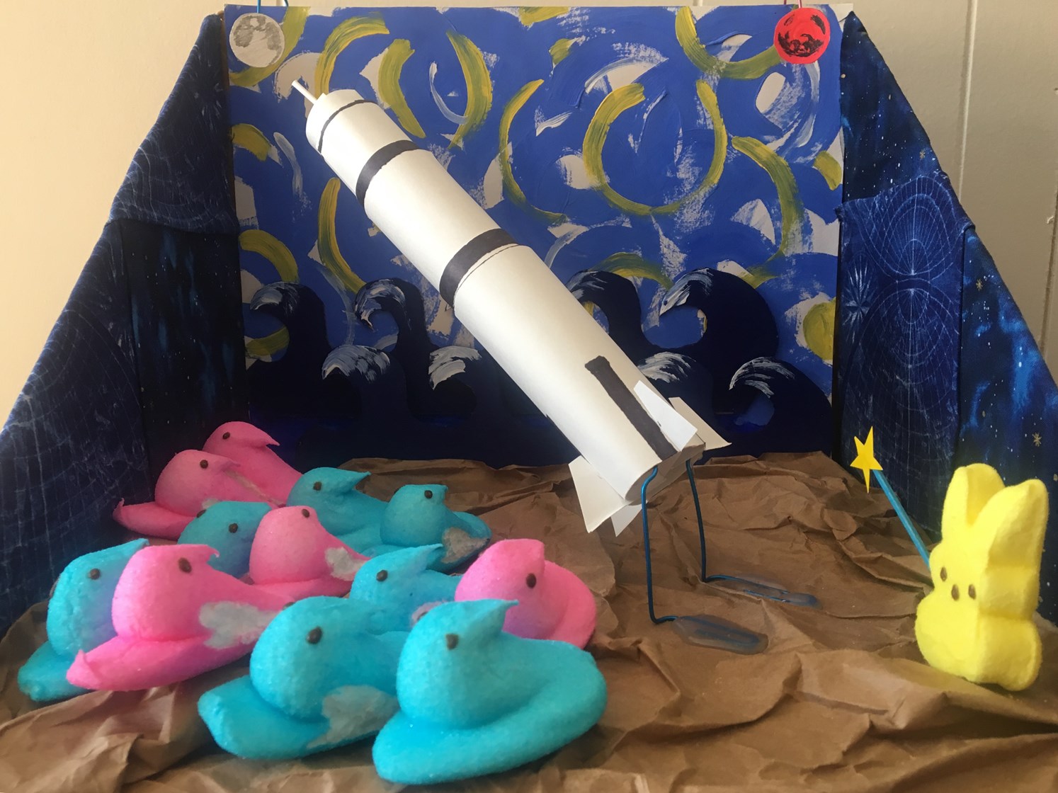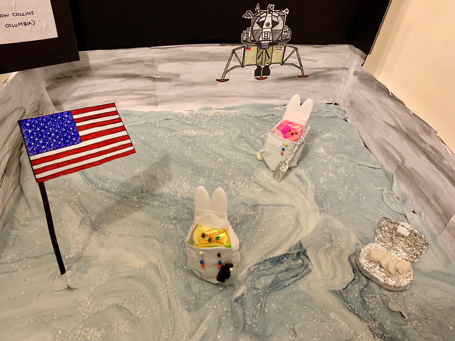 Astropeeps Bunny Aldrin and Neil Peepstrong explore Tranquilipeep Base — making history as the first sentient marshmallows to step on the moon. Marshmallow Collins drew the short straw and is orbiting up high in the Columbia capsule.