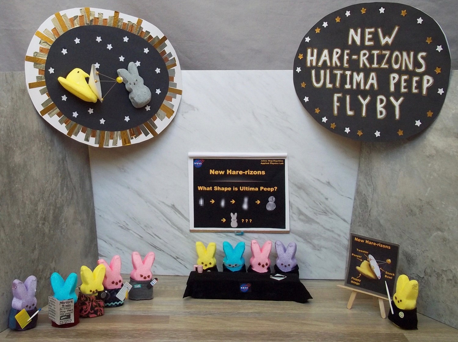 Peep scientists are investigating an unusual object at the far reaches of the solar system, known as Ultima Peep. The spacecraft New Hare-rizons is closing in, and images of Ultima Peep are becoming clearer. At first, Ultima Peep appeared to be shaped like a bowling pin, but now, some are beginning to suspect that Ultima Peep is shaped like a peep. (Perhaps it is a lonely space peep?) The peeple demand information! Scientists have called a press conference to weigh in, and journalists are peepering them with questions.