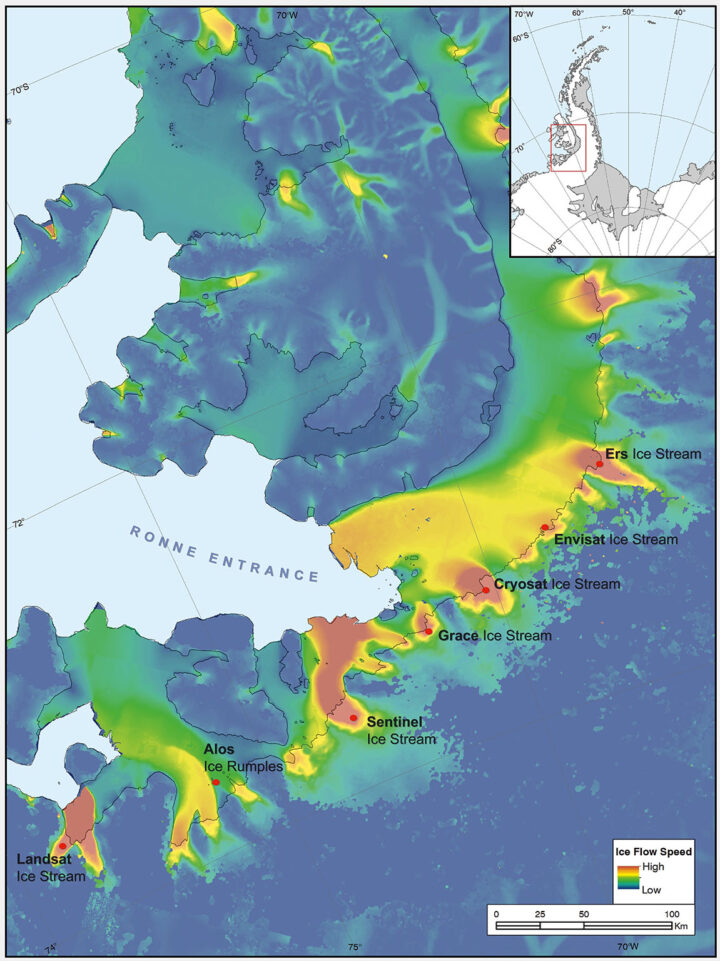 The seven features ring George VI Sound like pearls on a necklace. The new names, as officially entered into the British Antarctic Territory Gazetteer, are (from west to east): Landsat Ice Steam, ALOS Ice Rumples, Sentinel Ice Stream, GRACE Ice Stream, Envisat Ice Stream, Cryosat Ice Stream, and ERS Ice Stream.