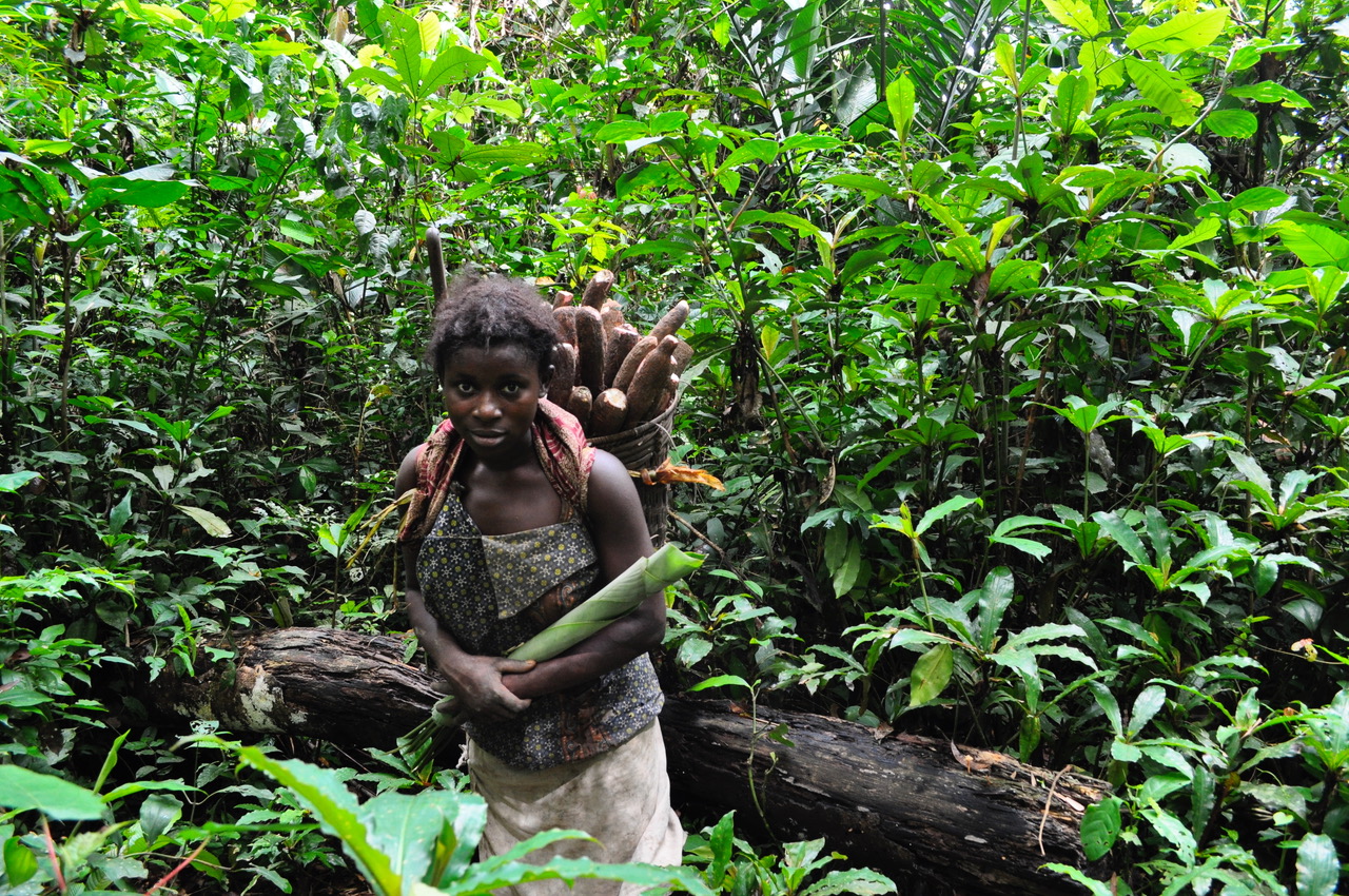 Sometimes roads are used by farmers to reach further into the forest and establish small-scale agricultural plots. The image below shows a small landholder in a forest near Mbandaka in the Democratic Republic of Congo. The woman is carrying a basket of manioc (cassava). She is also holding a maranthaceae leaf, which is commonly used for wrapping and cooking on a fire.