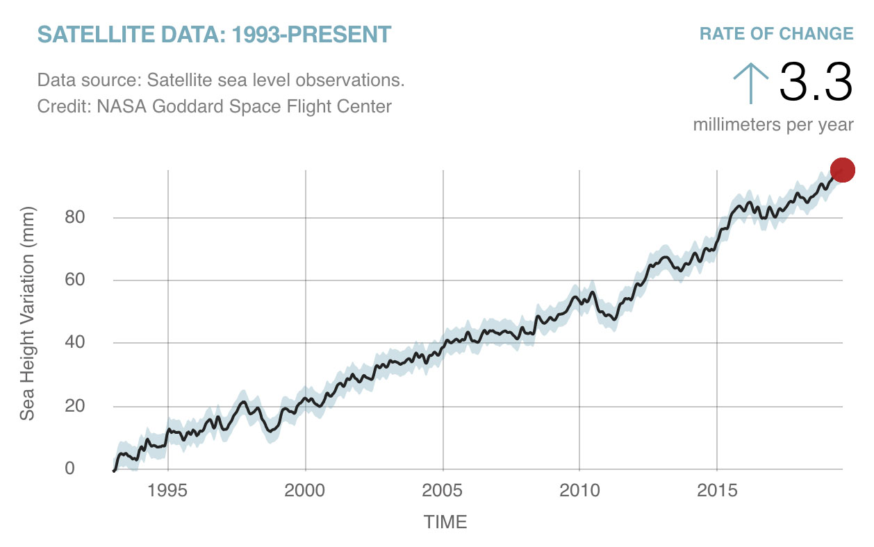 We can say now that sea level is rising at 3.3 millimeters (.13 inches) per year. We can show you a map of where exactly green vegetation has become more common and where it has faded. We can point you to a long-term dataset that will show you precisely where rain has fallen over the past two decades. And we can give you a tour of the world’s glaciers that shows you where they are and many examples of where they are shrinking.