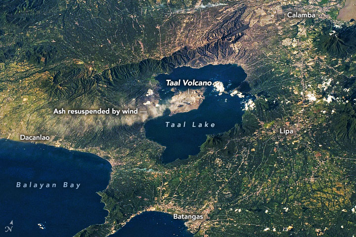 On January 12-13, 2020, Taal Volcano erupted for the first time in more than four decades. On January 22, ash plumes again emanated from Taal—but, this time, not from an eruption (seen above). According to the Philippine Institute of Volcanology and Seismology (PHIVOLCS), strong low-level winds lifted previously deposited ash lying around the volcano to heights of 5,800 meters (19,000 feet).