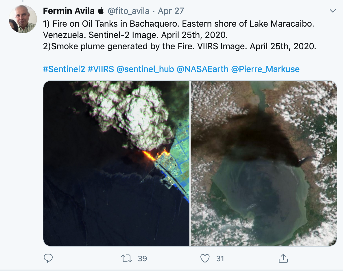 As noted in a recent Image of the Day (“A Fiery Month in Zulia”) satellites have detected lots of fire activity in western Venezuela in recent weeks. Just as we were finishing that story, a surprisingly large, dark smoke plume appeared in VIIRS and MODIS imagery. It bore little resemblance to the smaller, gray plumes that we had been watching. Forest and crops fires had caused the earlier plumes; the new black smoke was caused by a brush fire that had spread into a crude oil storage area, according to news reports.