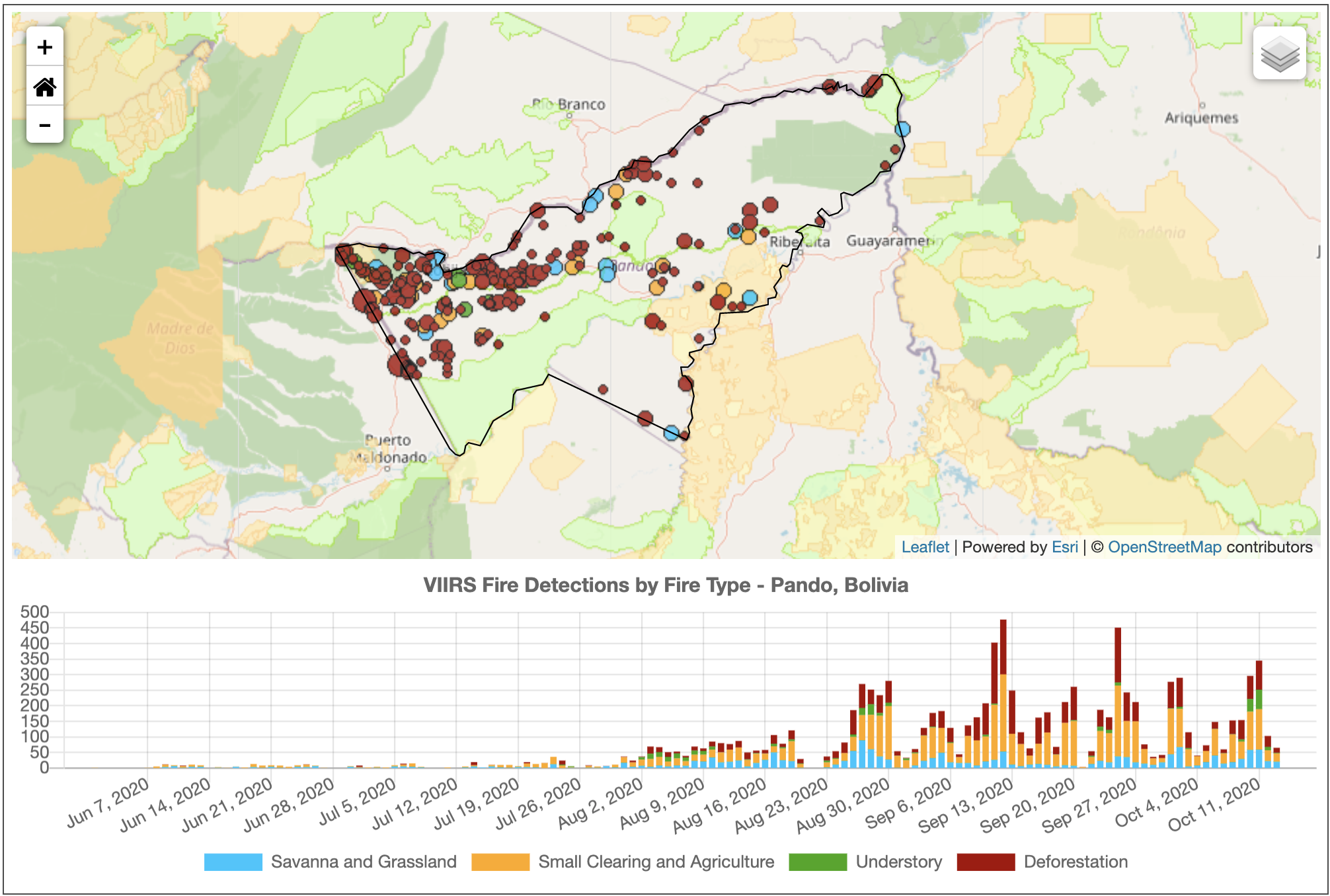 The charts above highlight the types and trends of fire type for three states (departments) in Bolivia. The northerly Pando department is still dominated by intact tropical rainforest. Satellites have detected large numbers of deforestation and agricultural fires burning there since August 2020, particularly along Highway 13. With more grasslands and fewer forests, El Beni has a higher proportion of the less-damaging fire types. The large Santa Cruz department, home to the Chiquitano dry forest and Pantanal grasslands, has comparatively large numbers of understory and grass fires.