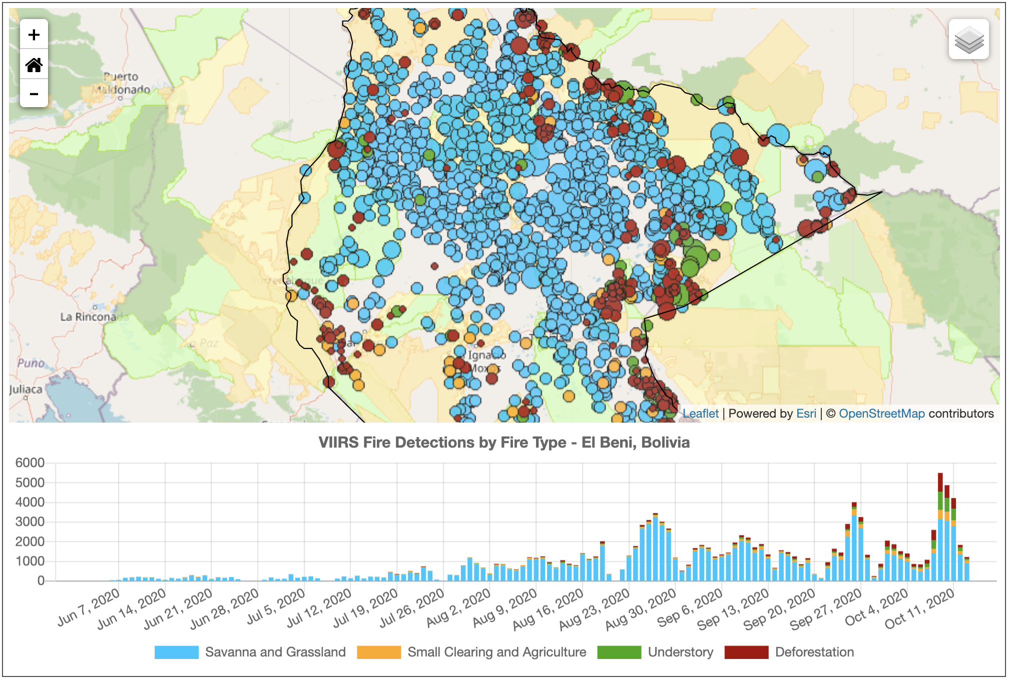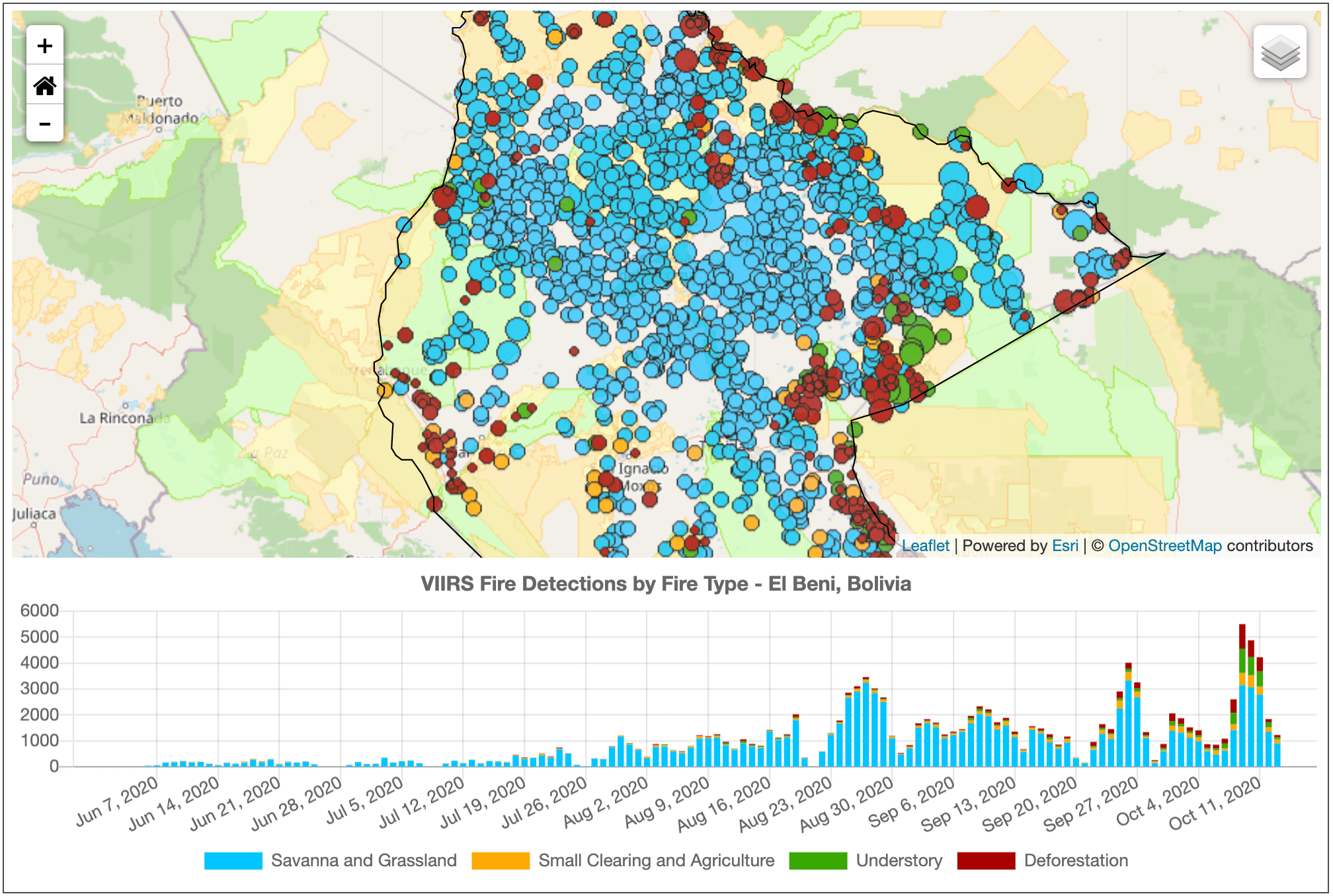 But not all the red dots on the map are of equal ecological significance. As these screenshots (below) from NASA’s Amazon fire dashboard make clear, there is a lot of variety in the types of fires that have burned in Bolivia in recent months, and they vary by region and ecosystem.
